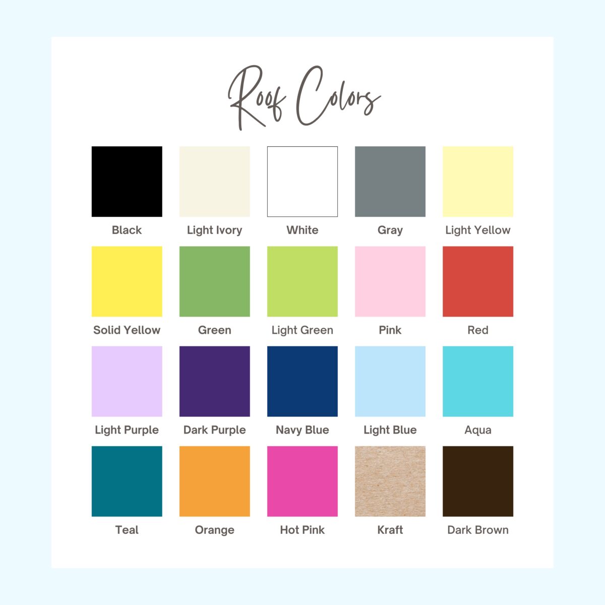 | Roof Color | Black, Light Ivory, White, Grey, Light Yellow, Solid Yellow, Green, Light Green, Pink, Red, Light Purple, Dark Purple, Navy Blue, Light Blue, Aqua, Teal, Orange, Hot Pink, Kraft, Dark Brown |