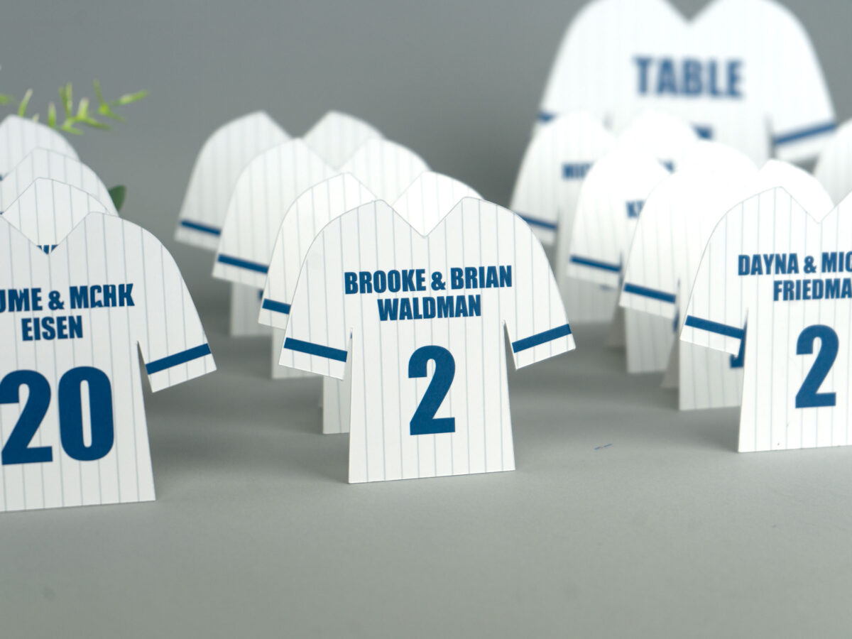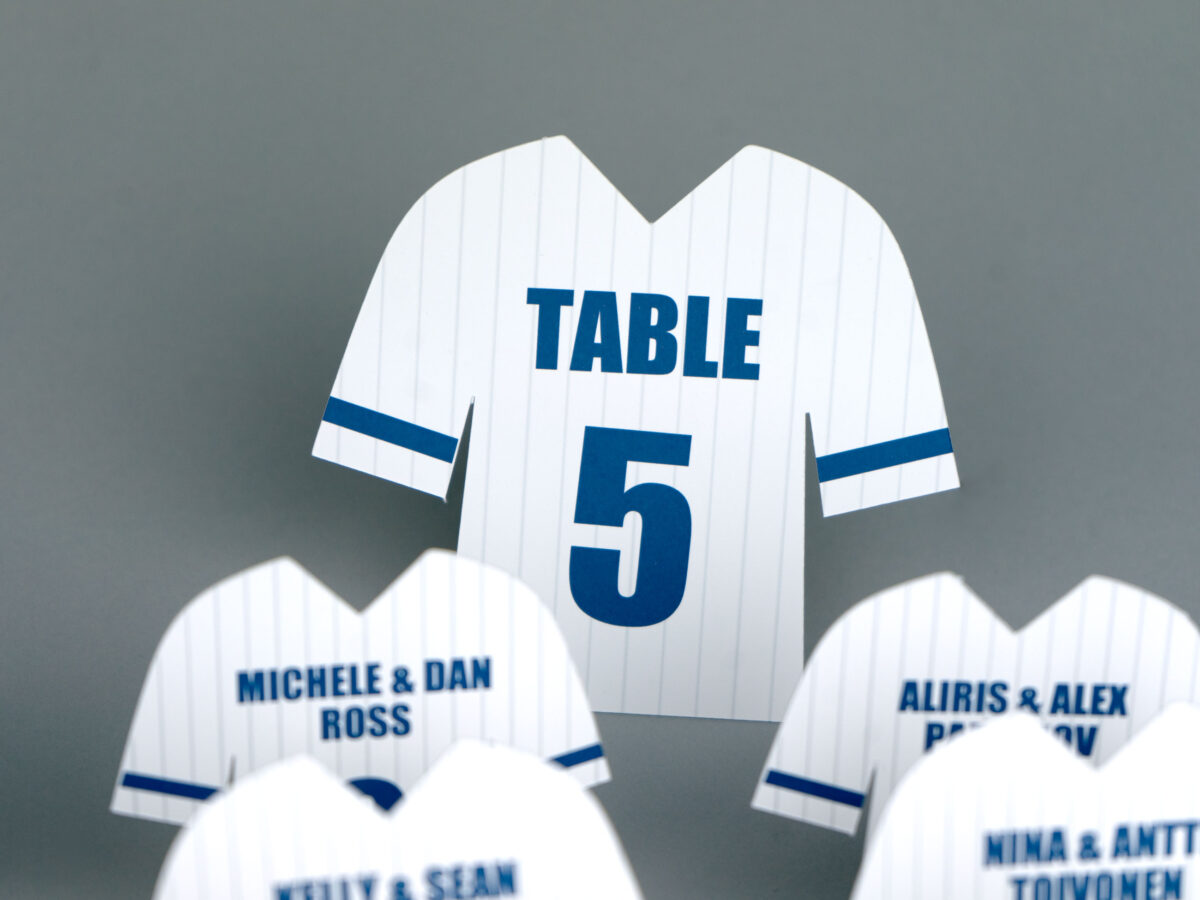 These pinstripe baseball jersey shaped freestanding table numbers perfect for a baseball or MLB themed party, wedding, or Bar Mitzvah!